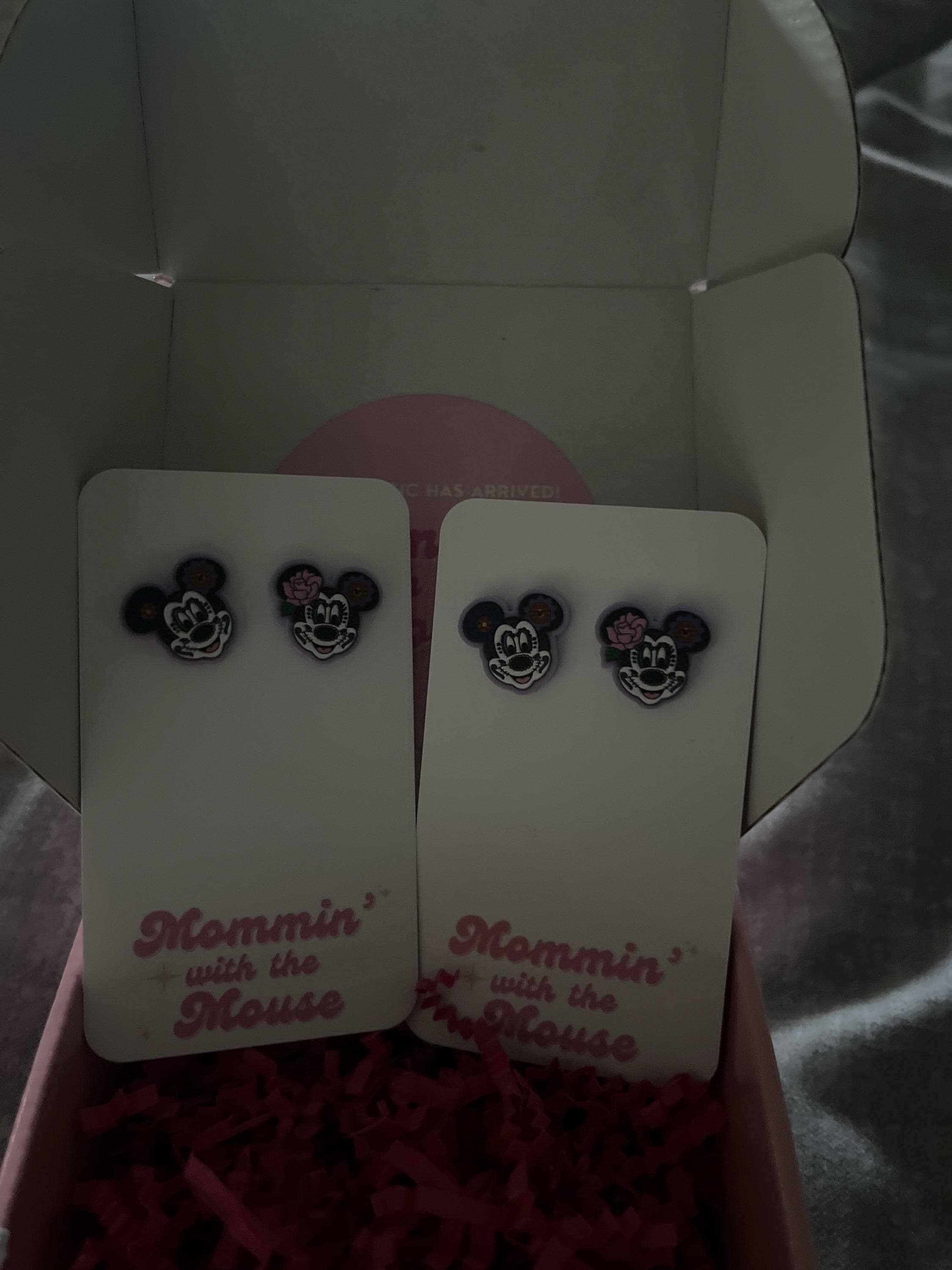 Mickey and Minnie studs are 18mm (1/2") light purple acrylic. Studs are available with hypoallergenic stainless steel posts, Plastic posts or as clip-ons.
